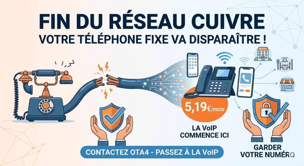 Votre téléphone fixe sonne, vos clients vous appellent, tout semble normal. Et pourtant, le compte à rebours est lancé : la ligne téléphonique traditionnelle sur laquelle repose votre activité depuis des années est en train de disparaître. Orange ferme progressivement le réseau cuivre commune par commune jusqu’en 2030 — et avec lui, le réseau RTC (Réseau Téléphonique Commuté) sur lequel fonctionnent toutes les lignes fixes traditionnelles. Ce sont les lignes fixes de milliers de commerces, hôtels et restaurants qui vont être coupées, souvent sans que leurs propriétaires le sachent vraiment.